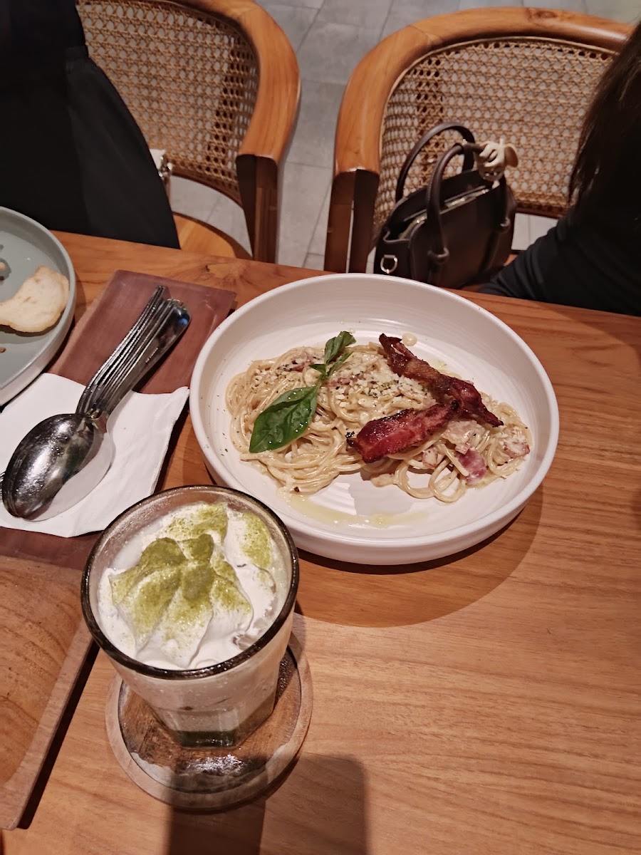 I really love the place cause its instagramable. When you enter, you already want to open your camera They have indoor and outdoor option, they are clean, neat when i was there its quite so i can enjoy everything there. I got Carbonara pasta and pineapple punch, it was lovely. The pasta is creamy and it came like what i expect. My boyfie got cheeseburger (it come with fries), and he says its nice. Overall good and the staff are friendly.